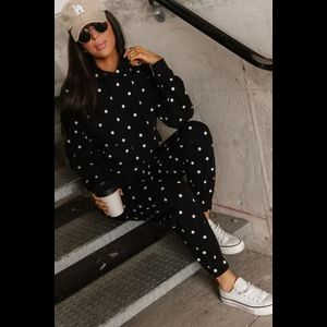Travel in style and comfort in our new jogger set featuring soft fabric and charming embroidered polka dots for a fun twist on everyday comfort. Cute enough for out-and-about, comfy enough for lounging!