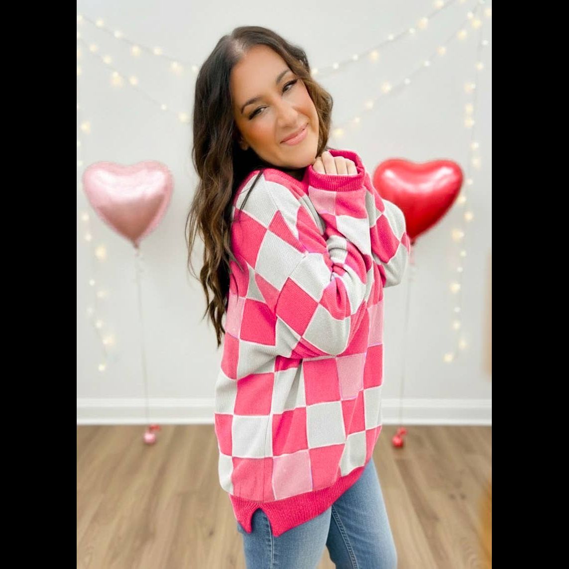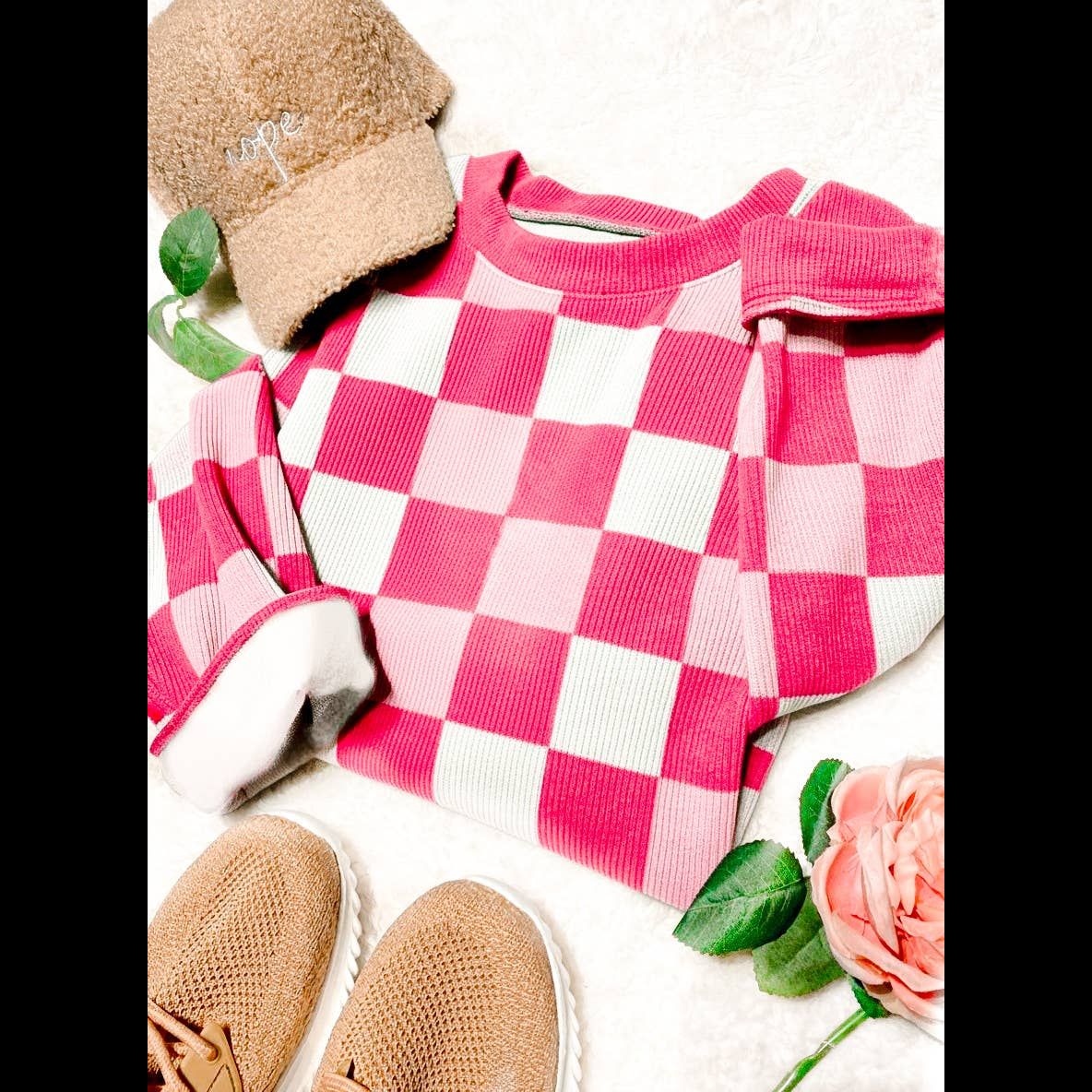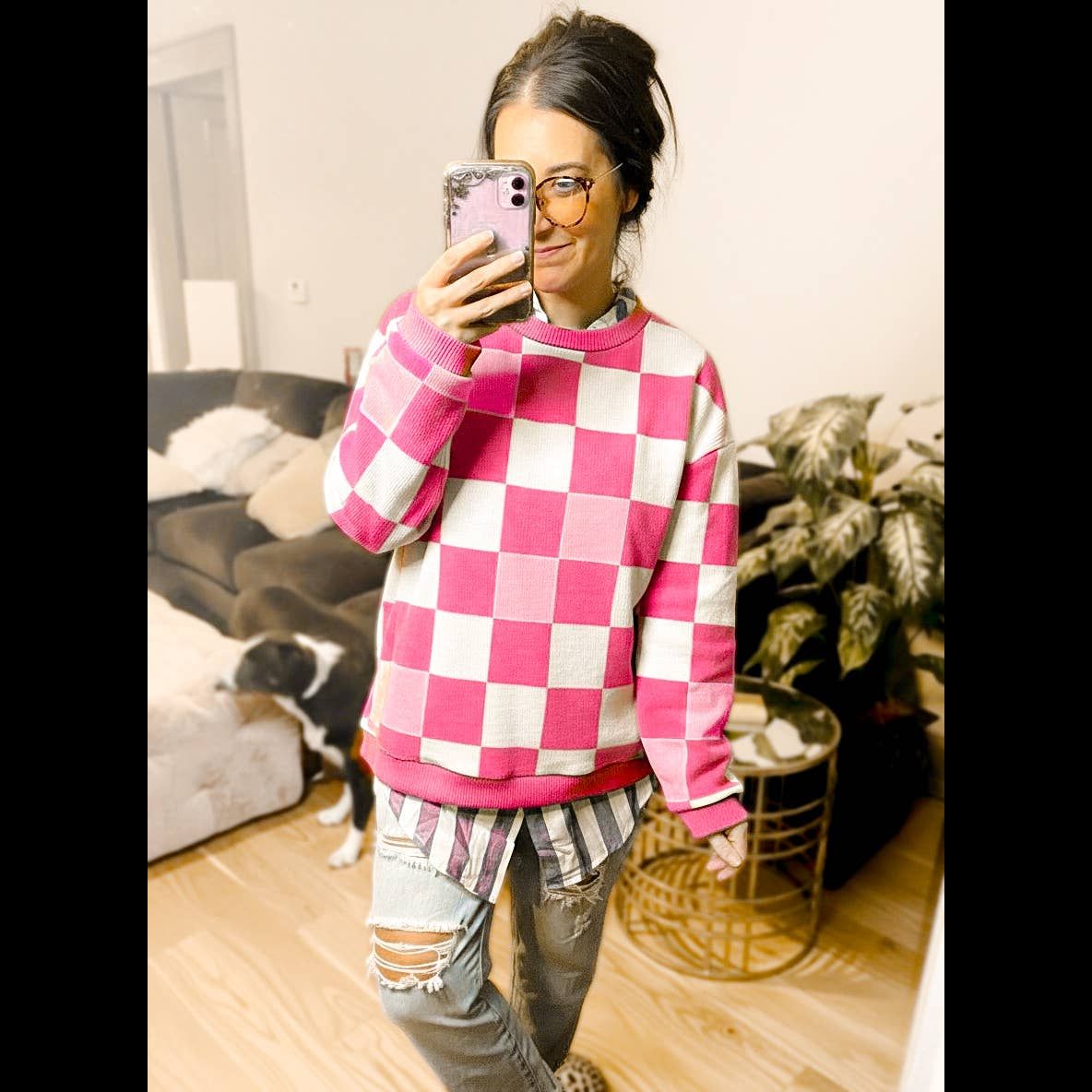 Meet your new go-to statement piece that also happens to be perfect for Valentine's Day and spring! Designed with a playful checkerboard pink print and crafted from ultra-soft chenille cotton, this cozy crew blends comfort, personality, and everyday wearability.